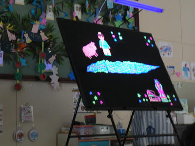 ブラック・パネルシアターで、七夕のお話を聞きます。きれいな光に歓声が上がっていました。
