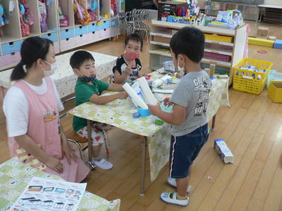 そら組さんとにじ組さんはそれぞれ物作りをしています。