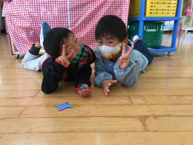 にじ、そらぐみさんは手裏剣を作って遊んだり、