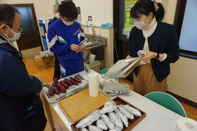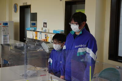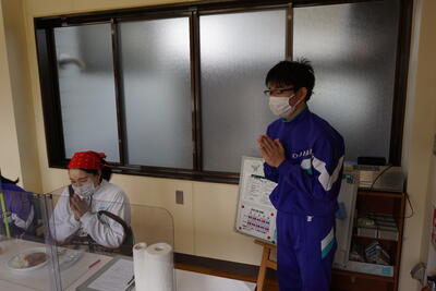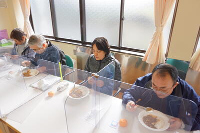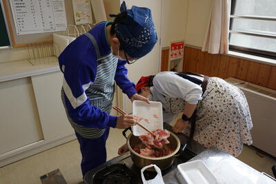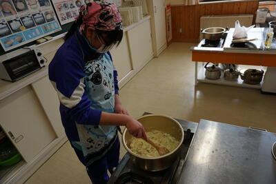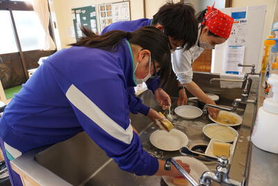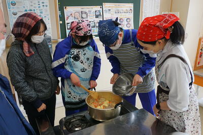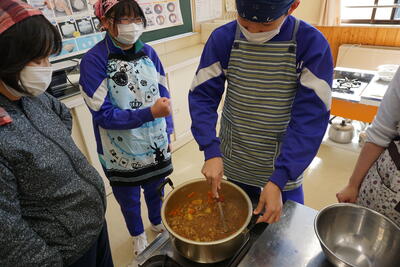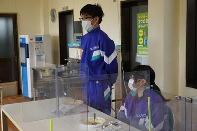 ランチルームに移動し、配膳です。調理・配膳と生徒たちはフル稼働です。先生方に「どのくらいですか」と聞きながらおいしそうに配膳できました。