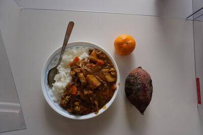 さあ、今日のメニューの完成です。具だくさんのカレーライスとほっこりと焼き上がった焼き芋。そして、みかんを添えて。みんなで作った最高のごちそうです。