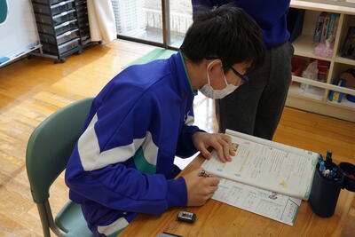 寒さに負けず、学習です。中2英語の時間。期末テスト対策です。単元テストの反省をしました。