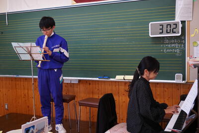 音楽の時間。先生のピアノ伴奏に合わせて、リコーダーの練習です。だいぶ上手に弾けるようになってきました。今度、先生方に披露する予定です。楽しみです(^▽^)