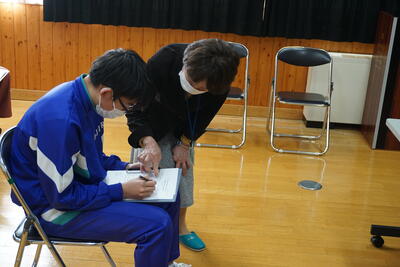 室内に戻って、訓練の振り返りです。今回の反省点は・・・。とにかく、火災がおきたときは速やかに逃げること。ただし、冷静に。特に、二次被害を防ぐことが大切になります。そして、何より煙を吸わないことを再確認しました。生徒からは、これから季節的に火災の多い時期になるので、十分に気をつけて生活したいとの発表がありました。