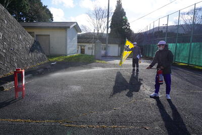 こちらは、消火訓練の様子。今回は、消防署より水消火器を借用して実施訓練をしました。担当の先生から使用の手順を学びます。生徒にとっては、初めての消火訓練です。