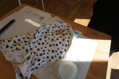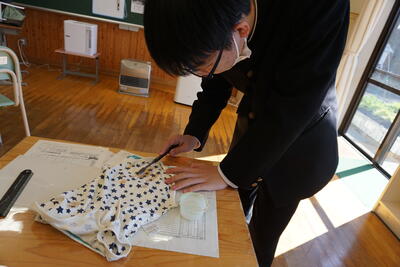旅行記作成のあとは、気分転換に家庭科での実習です。「シミ抜き」と「裁縫」を行いました。