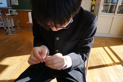 こちらは裁縫の様子。まずは、針に糸を通す作業から。普段からあまり経験のない作業なので、なかなか糸が通りません。