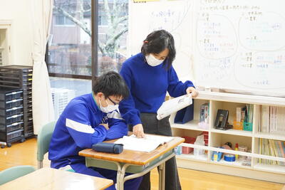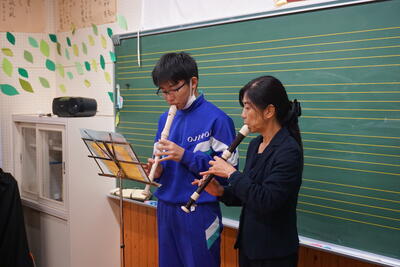 音楽の時間。リコーダーで大好きなジブリ作品のあの名曲を練習です。きれいな音色になるよう、先生を手本として練習しました。