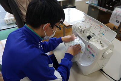 家庭科の時間。ミシンを使って裁縫の練習です。練習用の生地に書かれた線に沿って、縫っていきます。なかなかの出来です。手縫いよりも遙かにうまくいきます。