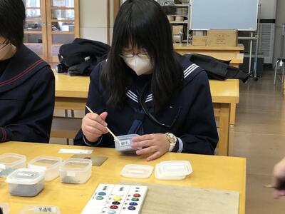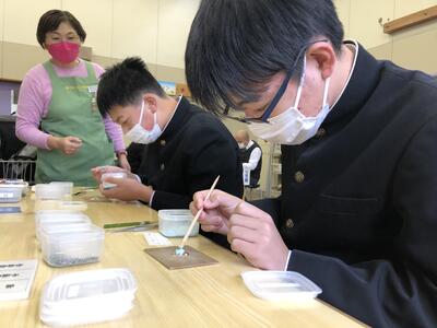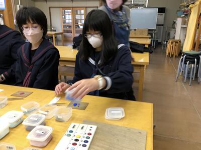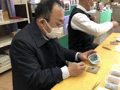 七宝焼の色を選んで、工程を確認します。スタッフの方の話によると、かの有名なツタンカーメンのマスクにも使われた技術なのだそうです。