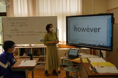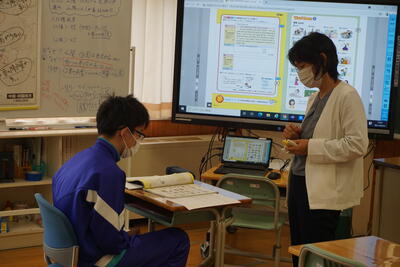 3時間目、中2英語の授業。デジタル教科書を使って、英単語の学習。「英語→日本語」、「日本語→英語」へと声に出して演習です。
