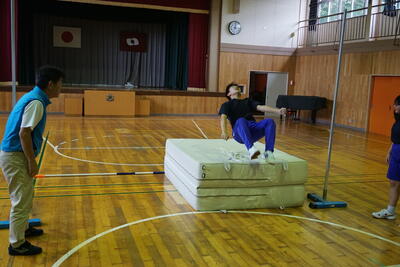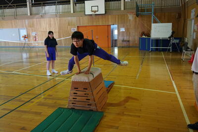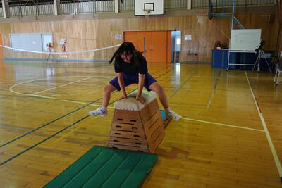 6校時、体育の授業。今日から器械体操で「跳び箱」の学習です。ロイター版の上手な使い方や手の付き方、手をついたあとの姿勢など、基本的な動作を反復練習しました。