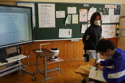 中2数学の授業。デジタル教科書を活用し、「方程式と1次関数」についての学習です。