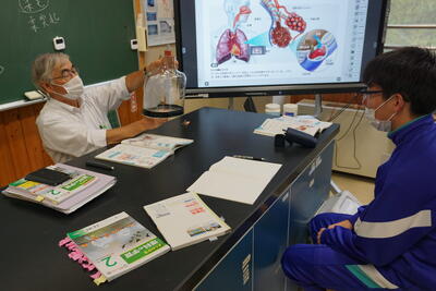 中2理科の時間。「人間の体のしくみ」についての学習。肺(呼吸)のしくみをデジタル教科書と模型を使って学習しました。
