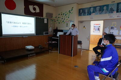 集会では、校長先生のお話ばかりではなく、各先生方が伝えたいことやレクチャーしたいことなど、自由に使える時間を設定することになり、今回第1弾として教頭先生から生徒と先生方にお話しをいただきました。内容は「大学時代の経験から」のメッセージ。