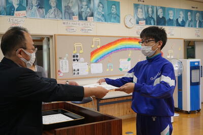 今月の集会の様子です。1学期に出品した「たなばた展(書写)」の表彰です。