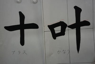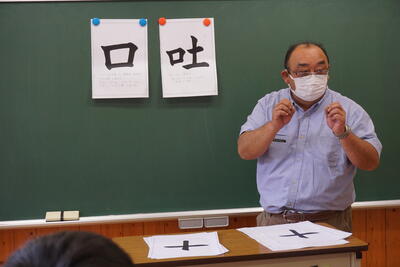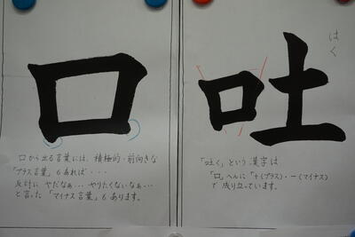 この吐き出される言葉には、プラスの言葉とマイナス言葉があります。吐き出される言葉から意識的にマイナスの言葉を決していくと、「吐」は「叶」の文字へと変化します。昨年の授業で「夢」の一文字の作品を書きました。その夢を叶えるためには、口から「できる」というプラスの言葉を発することが大切。そんな思いを込めて、「叶」の一文字に挑戦です。
