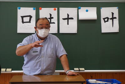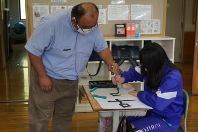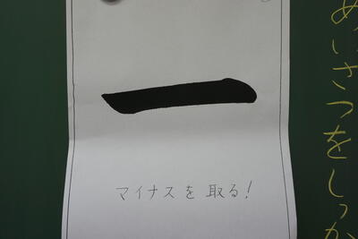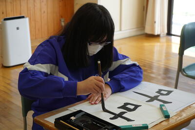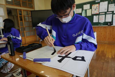 今日は、外部講師の佐藤先生による書写指導の日。生徒たちは、毎回、佐藤先生の授業を楽しみにしています。今回は「一文字」を書きました。一文字は簡単そうで、実はバランスを整えるのが非常に難しい、特に、画数の少ない文字特に難しいとのことです。さあ、その文字は・・・。
