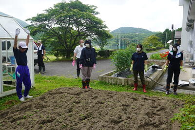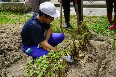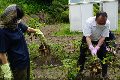 今日は、「小白井菜園」での今年度「初」収穫。収穫するのは、じゃがいも。「はりきって掘るぞ~」のかけ声とともに先生方も交えて収穫です。