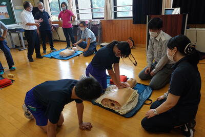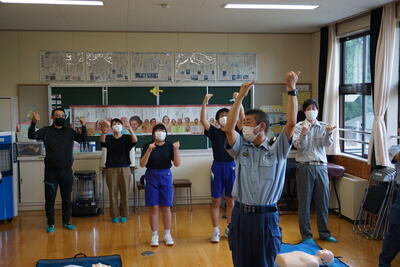 体と頭を柔らかくして、いよいよ実践です。これまで、毎年のように受けてきた講習なので手順などは十分把握していますが、いざやってみると忘れていることもあります。また、例年、見直しなどもあり、若干変わっているところもありました。特に、現在はコロナ禍ということで、さまざまな注意点がありました。