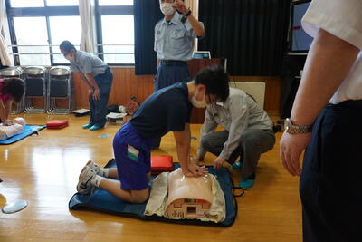 保護者の方や先生方も実践です。今日の小白井の気温は最高34度。今年一番の暑さもあり、みんな汗を流して講習を受けました。あらためて命を救うことの難しさとAEDを正しく使うことによって救われる命があることを学びました。