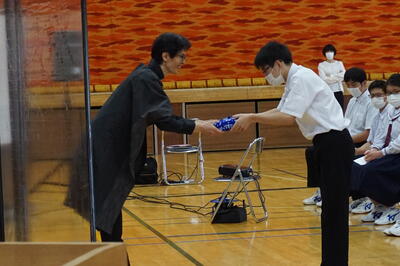 本校生徒は、感想で「美しい音色に引き込まれました」と発表し、代表で記念品を贈呈しました。