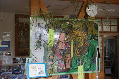 今日(7日)、七夕の日の様子。昇降口には七夕飾りをしました。短冊に願い事も。今夜は晴れるでしょうか。