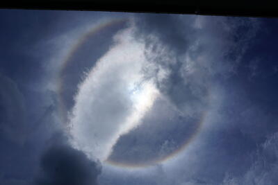 昨日(6日)の給食前。生徒が空を見上げると、不思議な光景を発見。気付いた先生方からも歓声があがり、急いで「パシャリ」とカメラにおさめました。いわゆる「ハロ」かと。ネット見たとおり、その後、冷たい風が突然吹いて天気は下り坂へ。