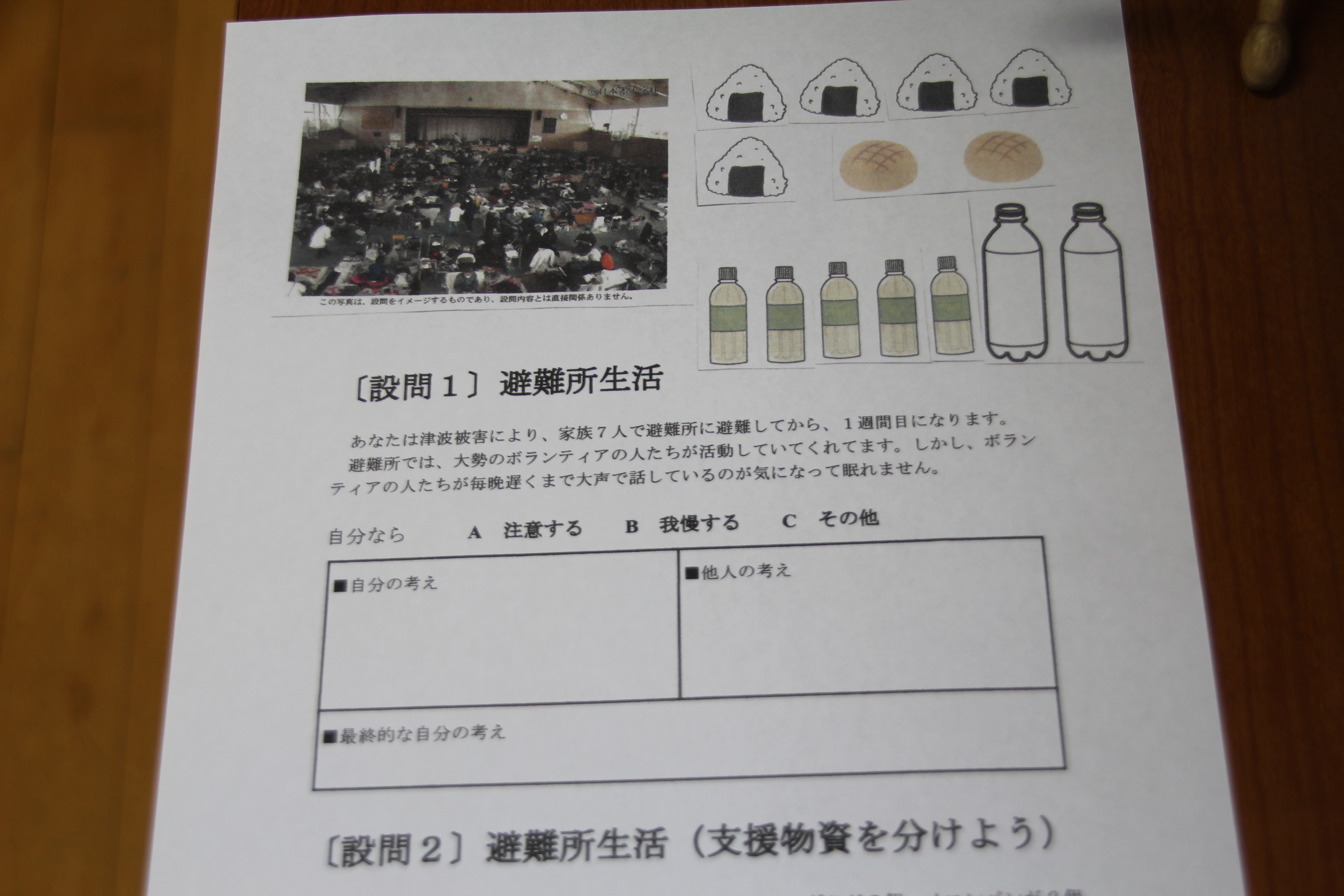 小白井地区は、海から遠いため津波そのものの被害はイメージしにくいため、今回は避難所の生活に関する内容を学習しました。今年度、台風による避難報道も多くあったため、「この地区の避難所である小白井集会所に50人が避難してきたと考えてください」という古山先生の投げかけは、とてもイメージがしやすかったようです。