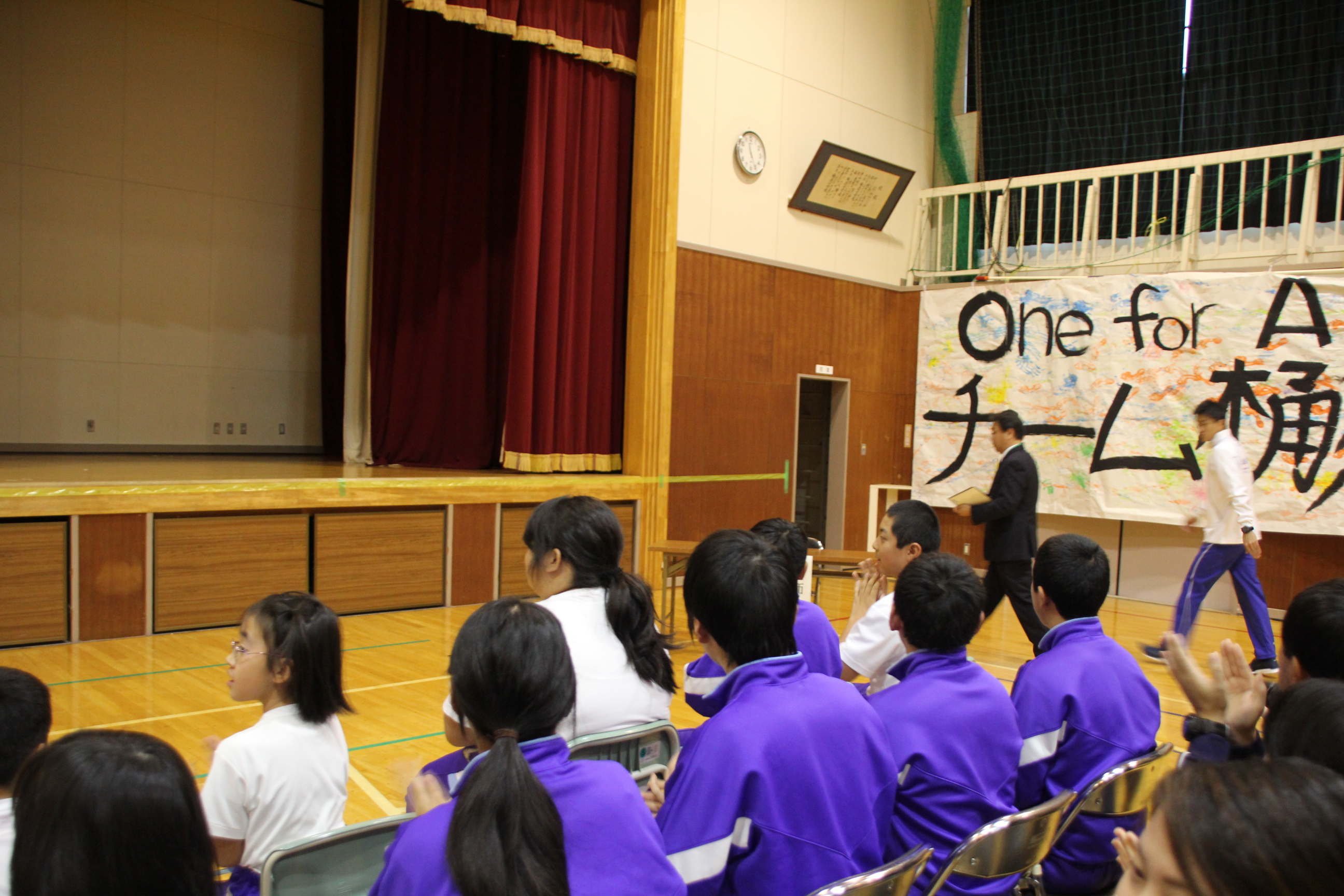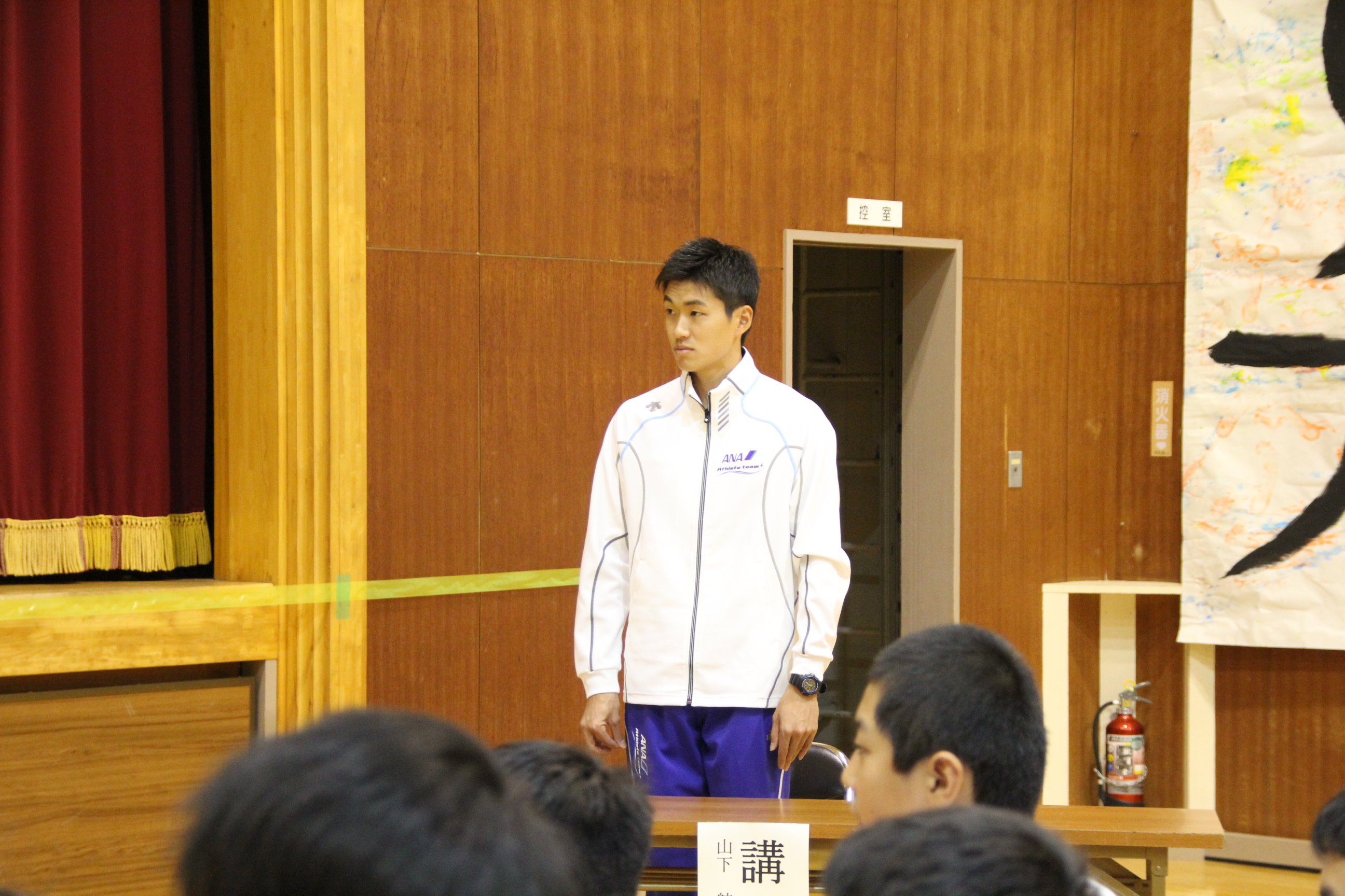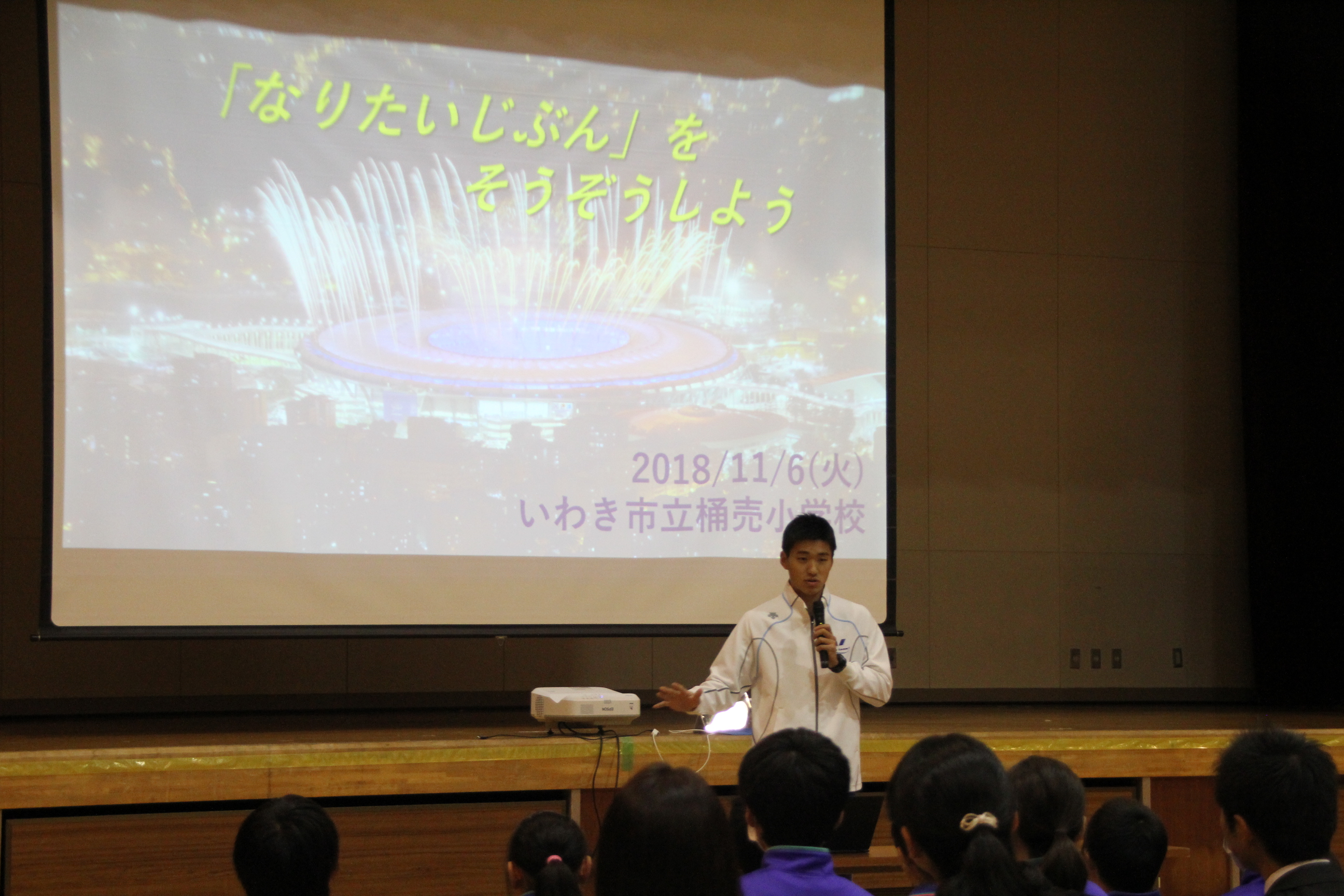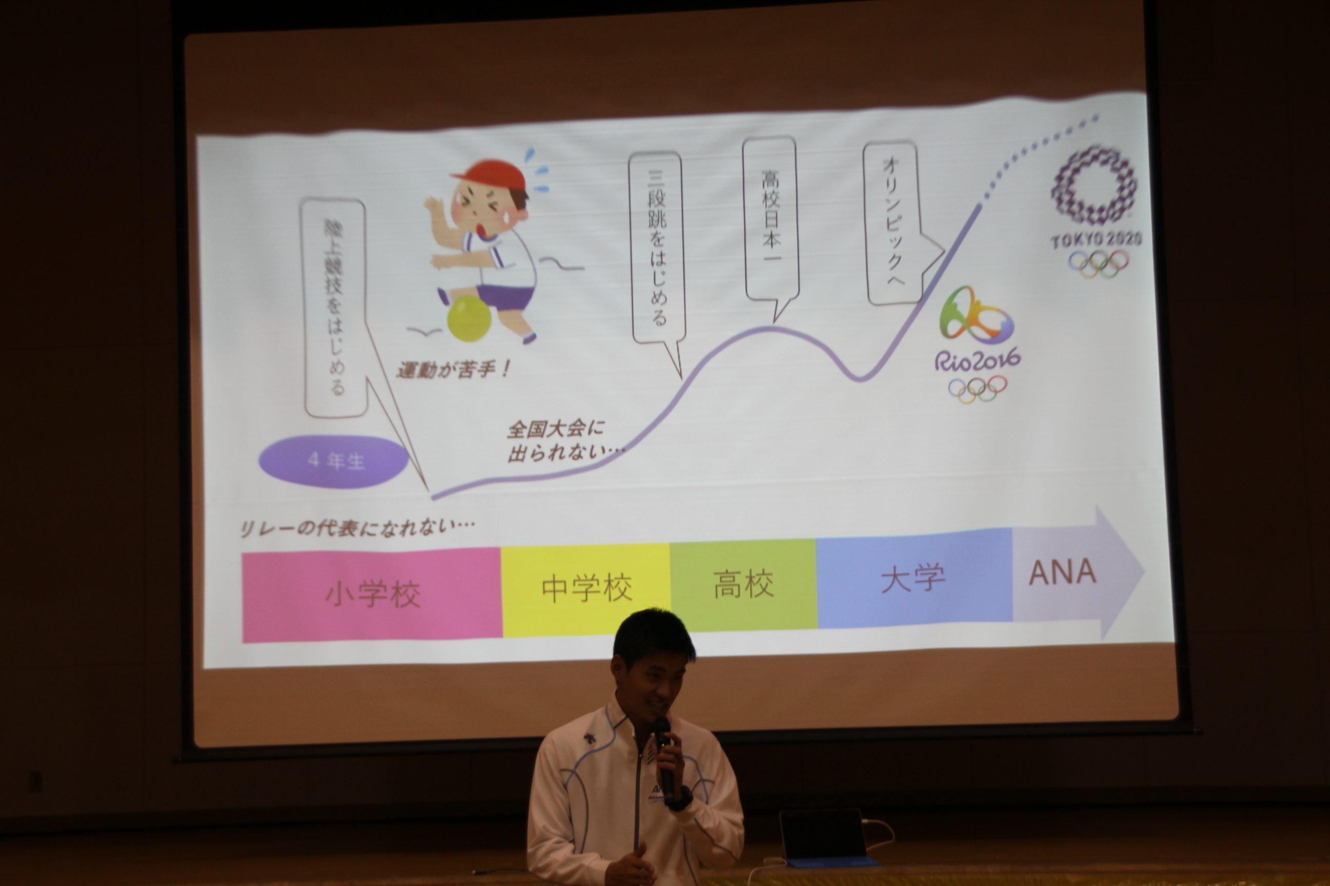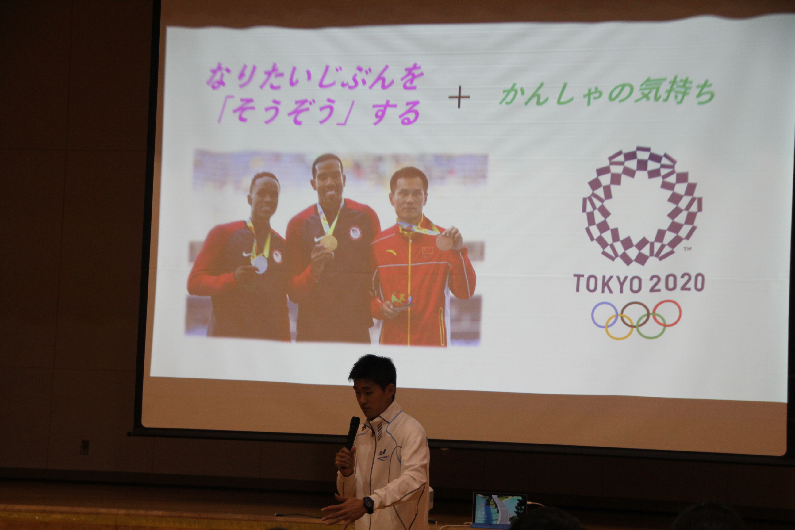 本日は、川前方部小中学校6校の児童生徒全員で、桶売小学校で行われている「オリンピック選手とふれあう会」に参加しています。リオデジャネイロ五輪 陸上三段跳び日本代表の山下航平先生を講師にお迎えして、「なりたい自分を想像しよう」というタイトルで講演をいただきます。始まる前から、会場はワクワク感いっぱいの雰囲気。いよいよ、山下先生が拍手に迎えられ、登場し、講演スタートです。