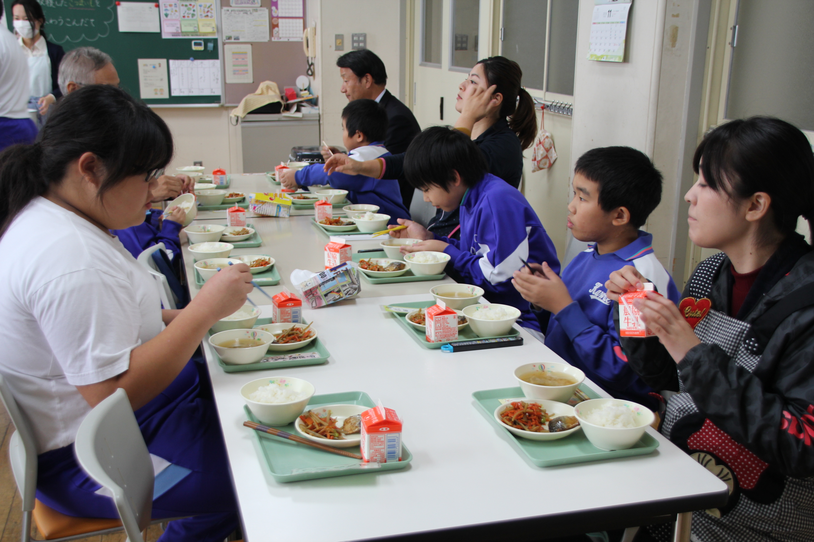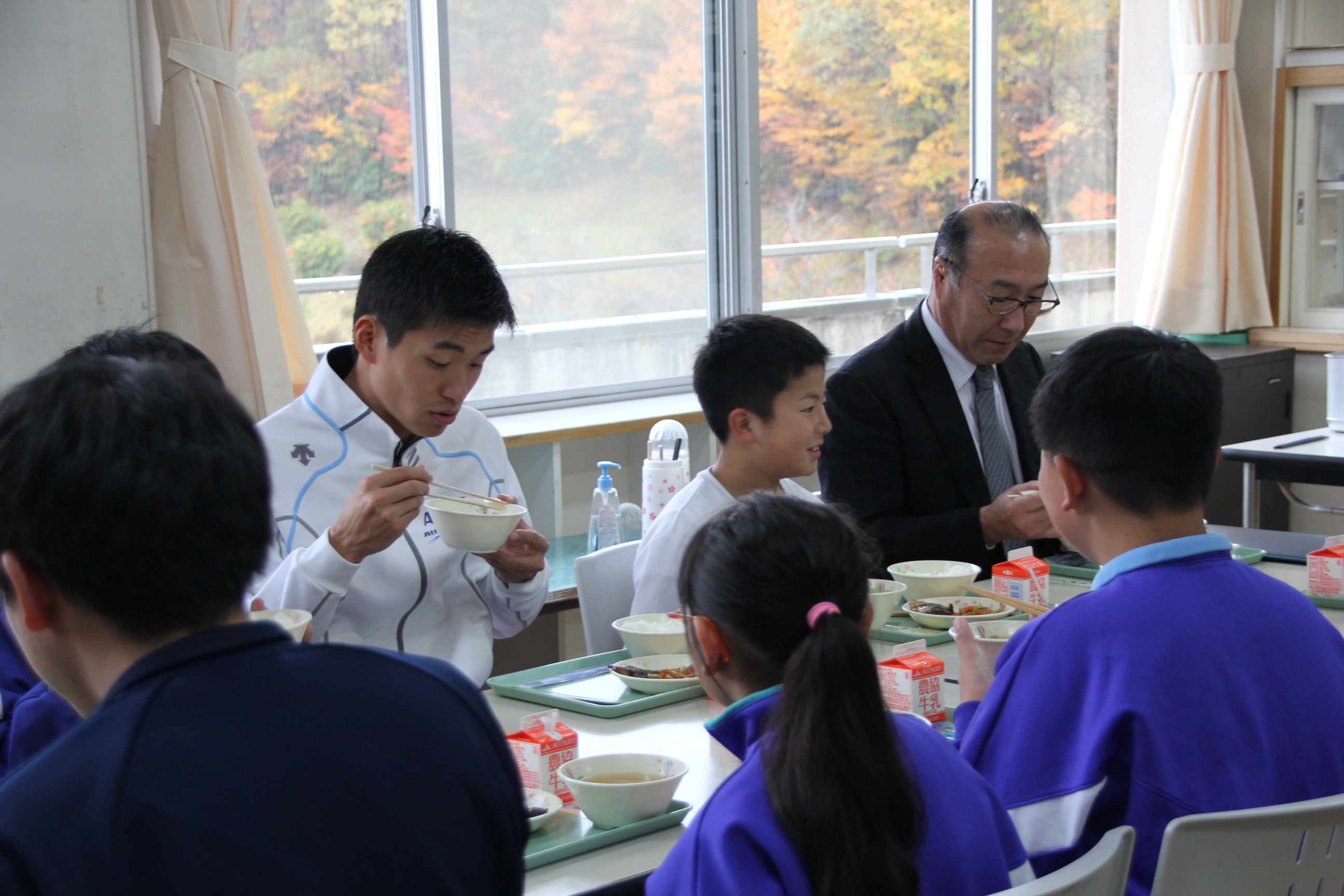 最後は、方部の児童生徒合同の給食です。小学校の方には、山下先生も来ていただきました。