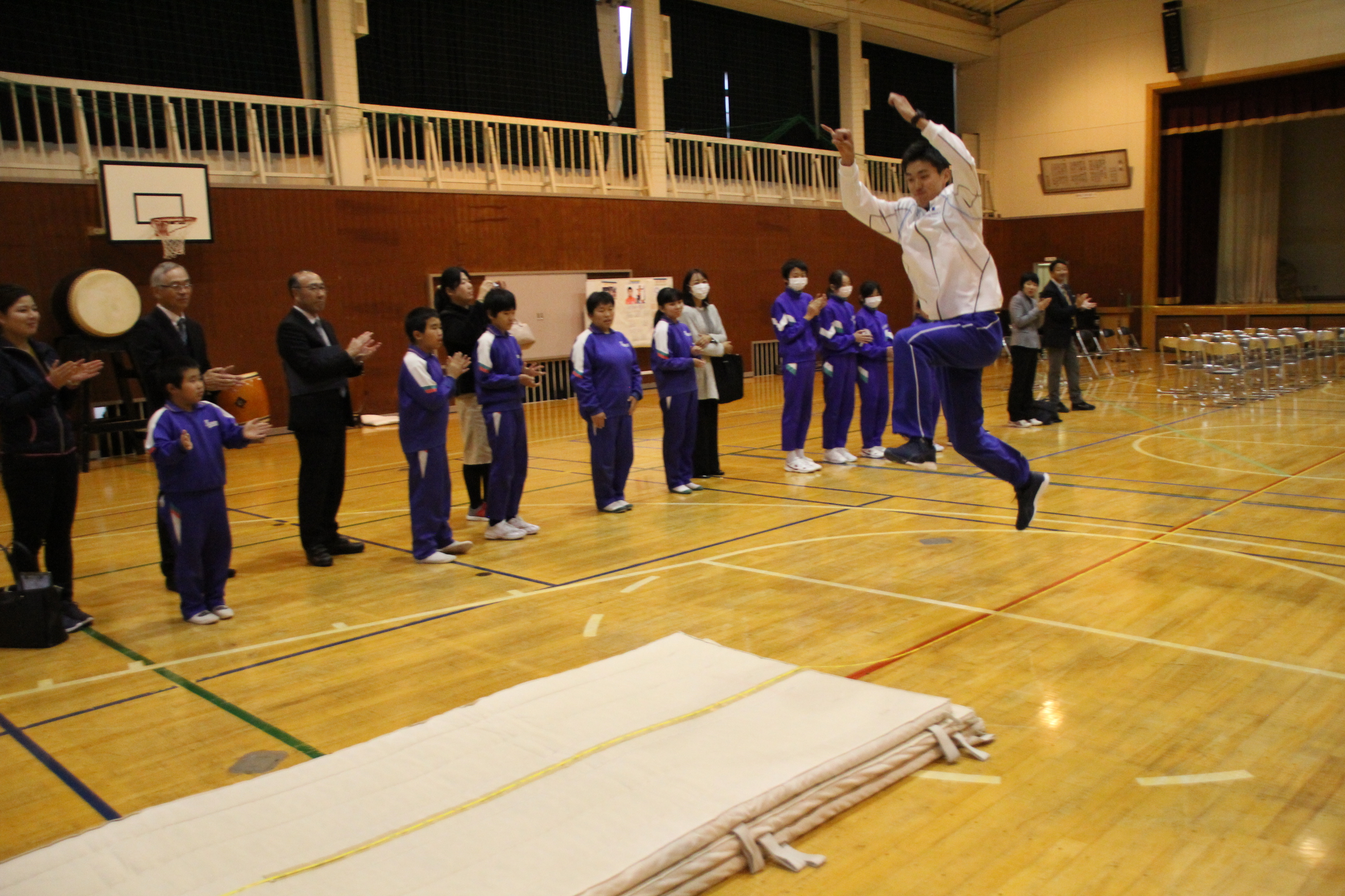 その後は、山下先生による三段跳びの実演を見せていただきました。初めて見るトップアスリートの跳躍力に、会場は拍手歓声に包まれました。