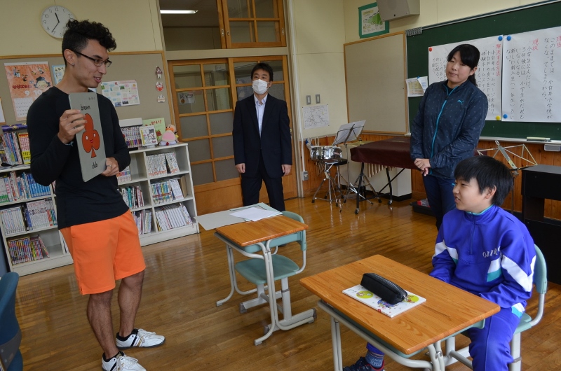 今日は、ALTの先生が来校しました。児童は英語のクイズを用意し、楽しみに待っていました。
