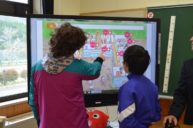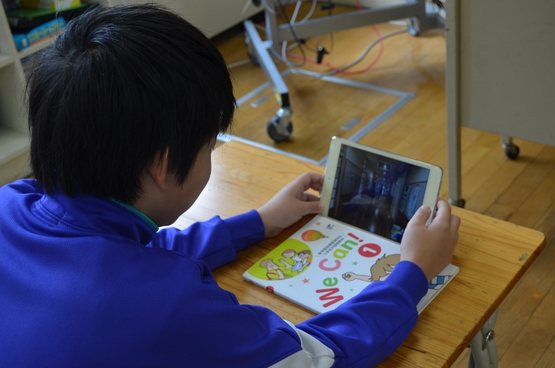伝え方が分かったら、スマートフォンを介してALTの先生の様子を見ながら頑張って道案内をしました。児童は教室で、iPadを使い、ALTの先生はスマートフォンのTV電話アプリを使用しての道案内です。画像を見ながらの道案内は、臨場感のある活動で、児童は集中して学んでいくことができました。