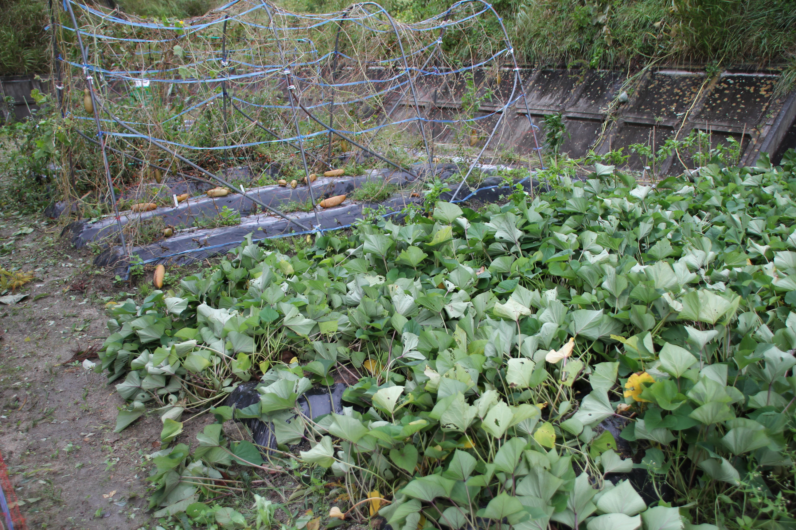 2018年10月1日 07時17分現在の学校敷地内の様子です。網戸1枚の落下を除くと、施設の破損等はありませんでしたが、学校畑の作物、植物の倒壊と周囲の木々や枝の散乱がひどい状況です。児童生徒の皆さんは、10時登校となりますが、十分に気をつけて来るようにしてください。
