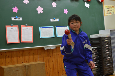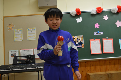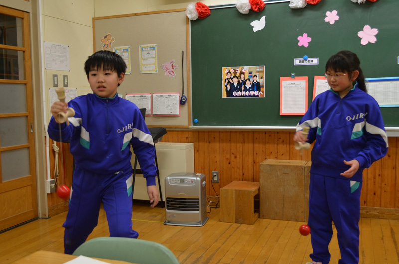 現在、小白井小学校では、休み時間の遊びにけん玉が流行っています。子どもたちは、けん玉の本を参考にして様々な技の練習をしていました。