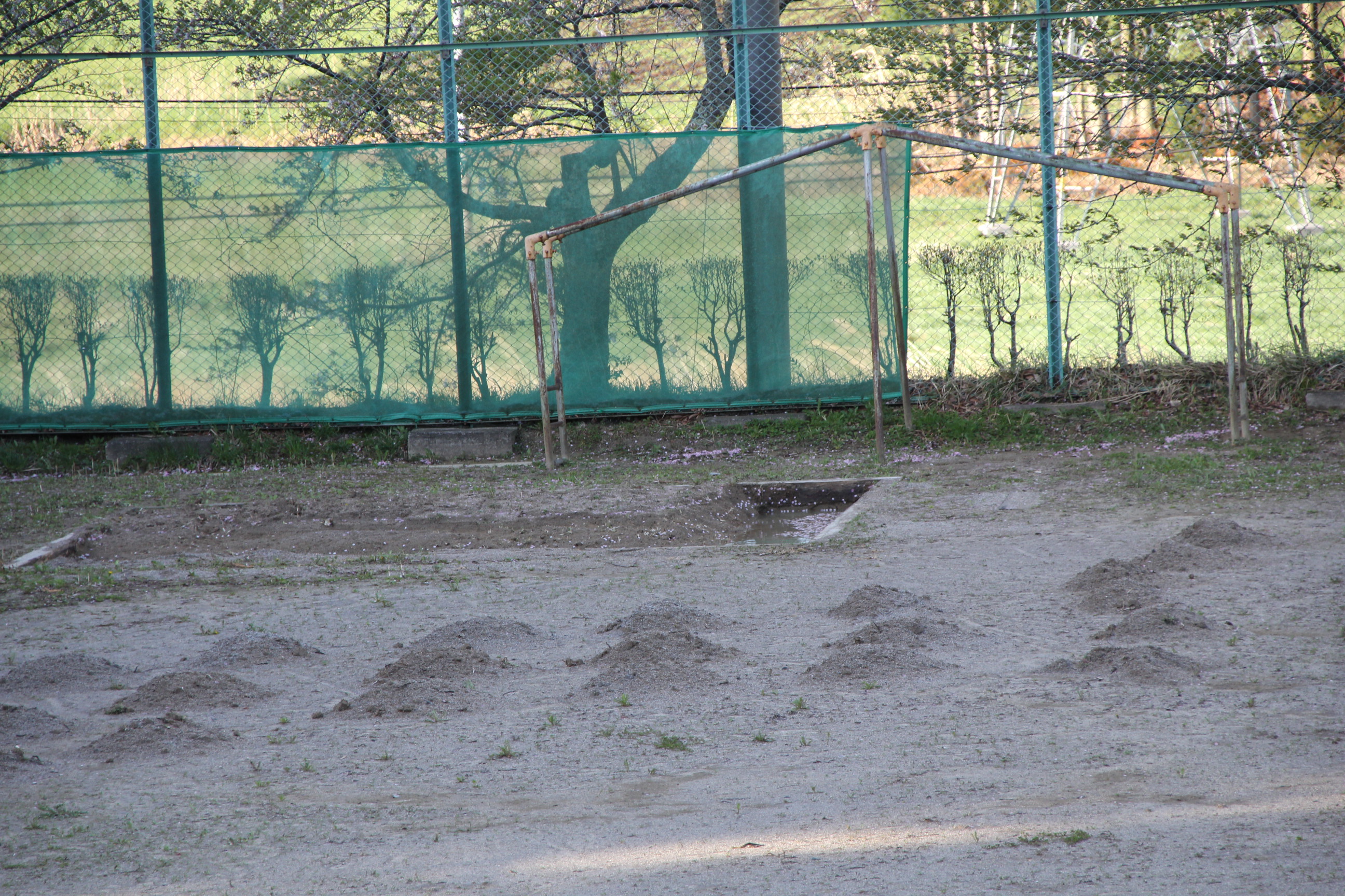 校庭に目を移すと、用務員さんが砂場から掘り起こしてくれた砂が山となって並んでいます。こちらは、運動会に向けて校庭の低くなっている部分を調整してくれるためのものです。(残念ながらトラックの線は雨で消えてしまいました)