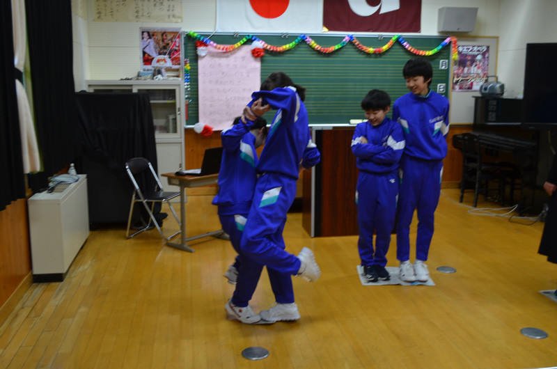 はじめに中学生の抱負を聞いた後は、小学校の出し物です。1つ目は「上げ下げゲーム」です。5文字の言葉を一文字ずつ言いながら、濁点の人は手を上げて、それ以外はしゃがみます。ゲームの説明も小学生たちで上手に行うことができました。