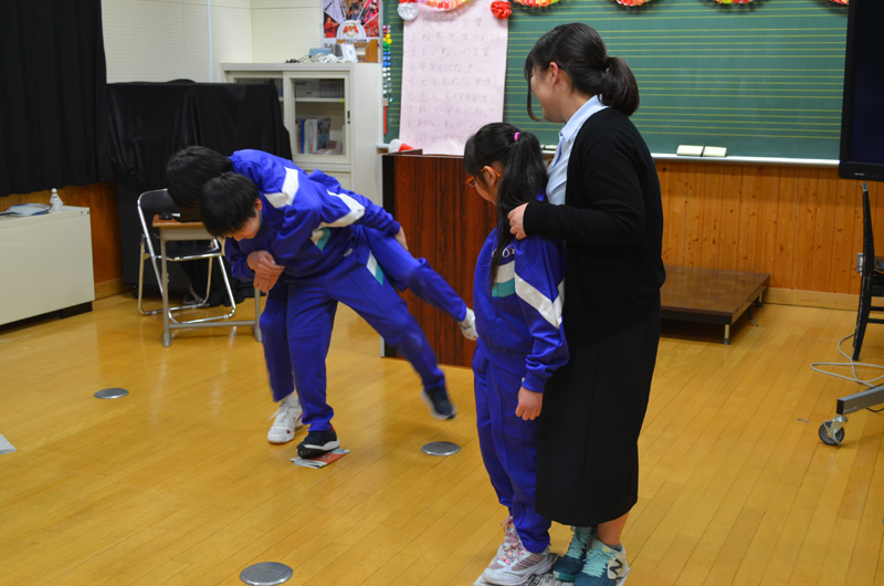 ゲーム本番では、児童が手を上げながらしゃがむというおもしろい格好になり、みんなが笑顔の楽しいゲームになりました。