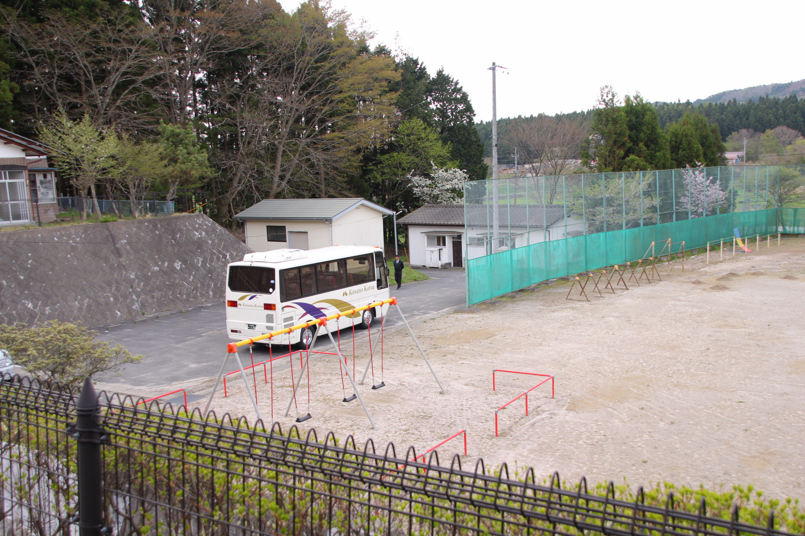 見慣れない大きなバスが学校に到着。これから出発式です。