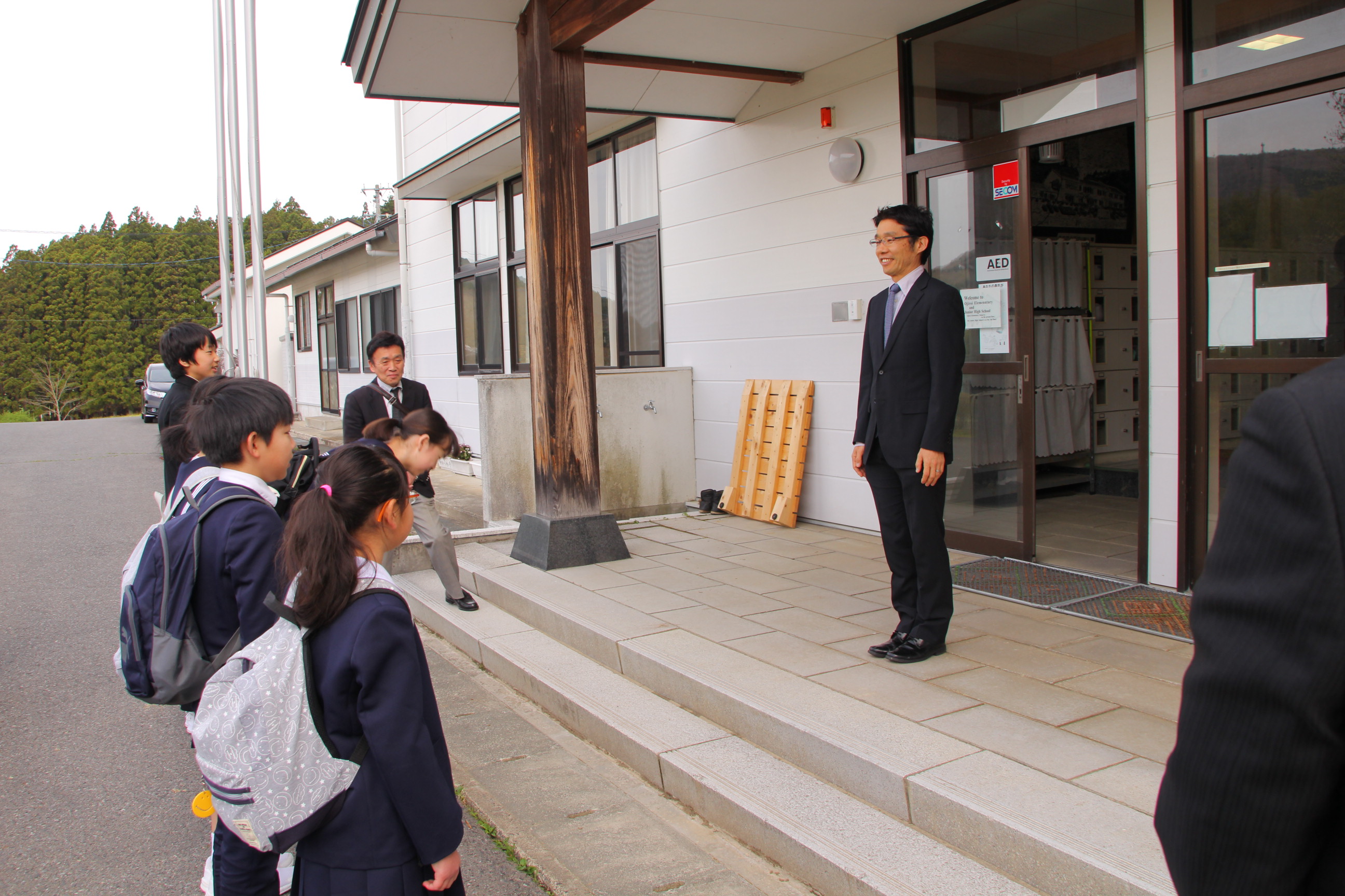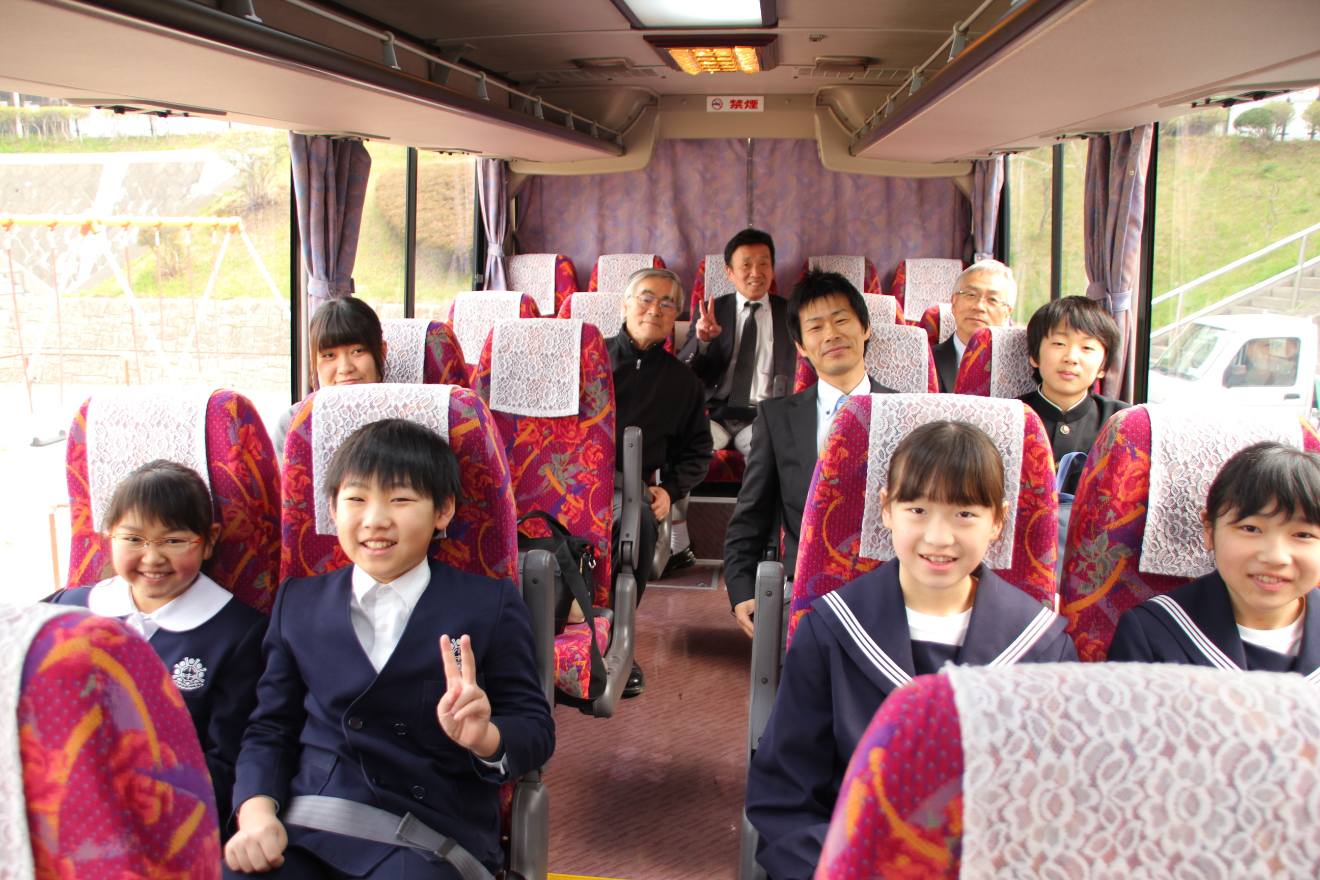 出発式では、校長先生から「あいさつをしっかりすること」「具合が悪くなった時は、無理をせず早めに申し出ること」の2点が伝えられました。学校に残っていただく三杉教頭先生に「行ってきます」のあいさつを元気に行い、いよいよバスが出発しました。