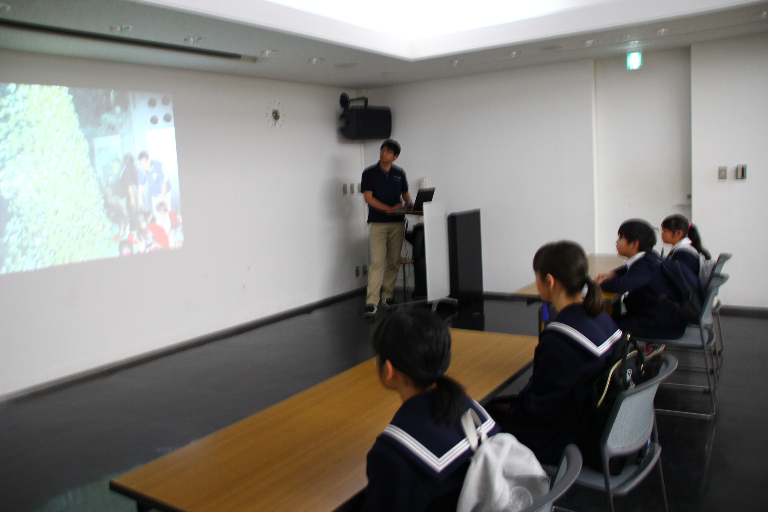 震災学習プログラムの様子です。廣川指導主事より、震災当時の状況を問いかけを交えながら、分かりやすくご説明いただきました。「どの生物を生かすのか」という命の選択を迫られた当時の状況に、児童生徒たちは、息を飲み、真剣に聴き入っていました。
