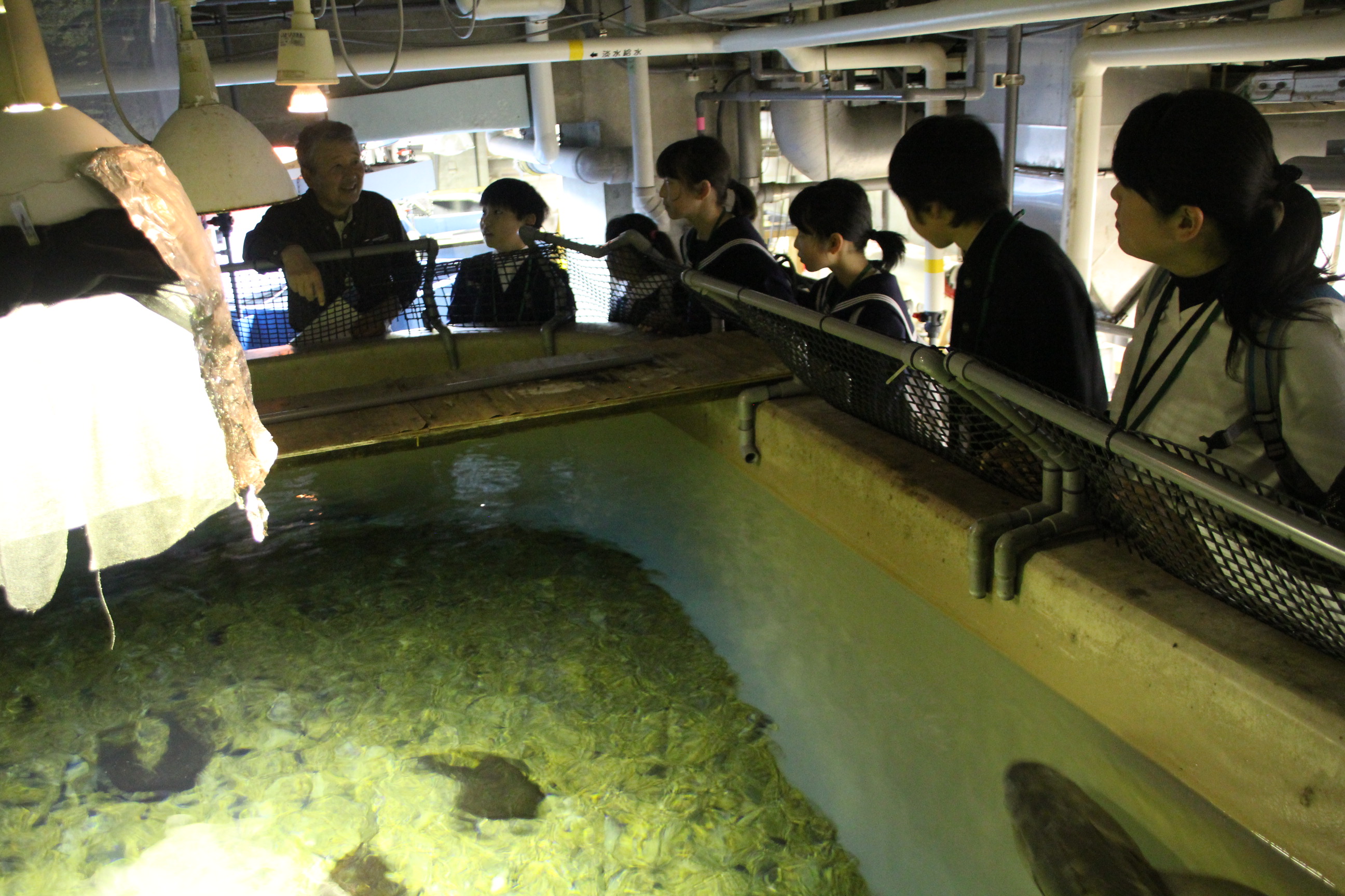 続いては、バックヤードツアーです。普段は見ることのできない、水族館の裏側を見ることができました。こちらは、ボランティアスタッフの船生さんにご案内いただきました。