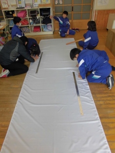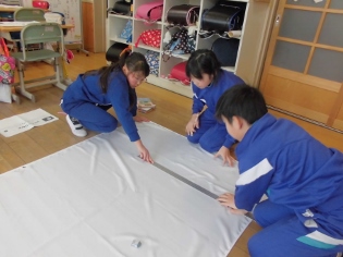 始めは基準となる線を引いていきます。大きな物に線を引くのも大変ですが、素材が布なのでシワやたるみに気をつけながら引く作業が子どもたちにとっては大変だったようです。次回は10分の一のレイアウト通りに、文字や絵の位置を決めていきます。
