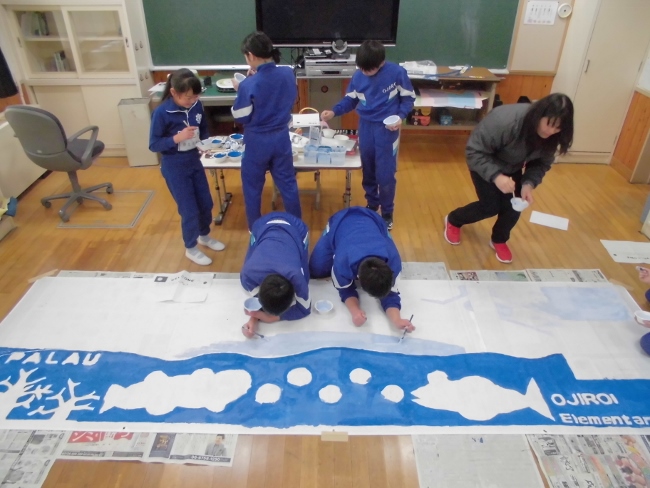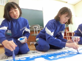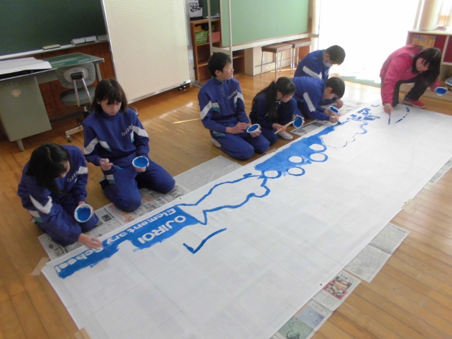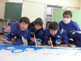 午後には、横断幕作りを進めていました。児童はまだまだ塗るのに苦戦していますが、そんな中でも丁寧に塗ることを意識して頑張っていました。