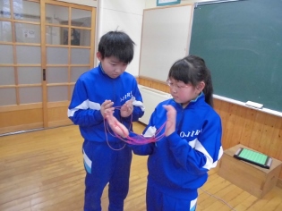 今、小白井小学校ではあやとりがブームとなっており、休み時間になると一人あやとりの早さを競ったり、二人あやとりを変わった形にしてみたりと楽しそうに過ごしています。