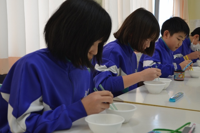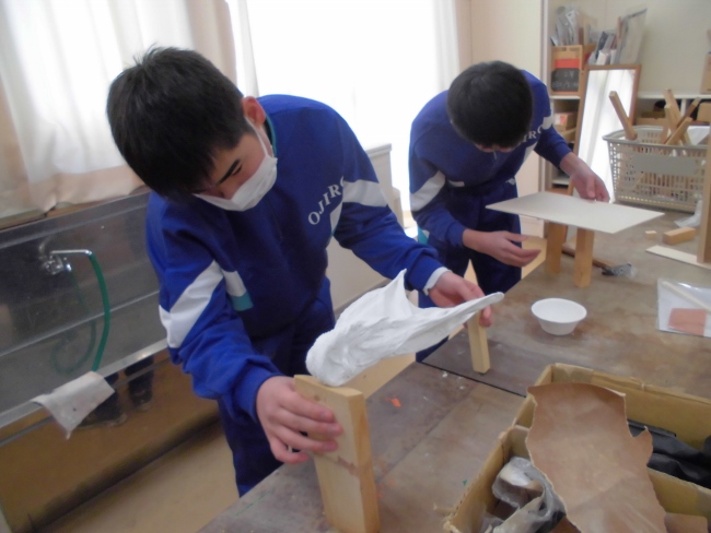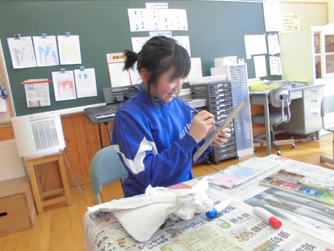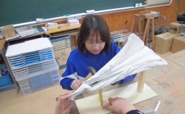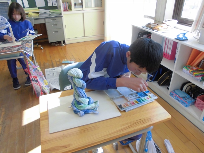 今日は以前、図工の時間で布に液体粘土をしみこませて固めた作品の続きの作業を行いました。子どもたちは固まった布の形から様々な発想をして、土台決めや色づけをしていきました。