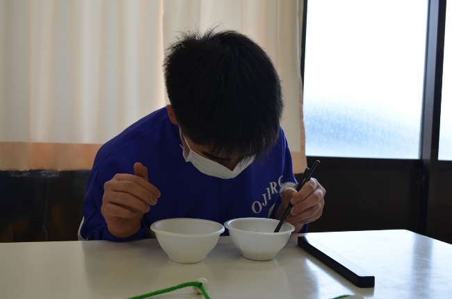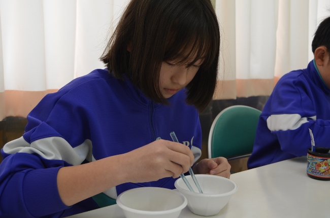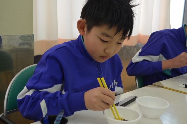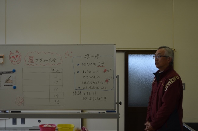 豆まき大会を前に、豆つかみ大会を開催しました。箸の持ち方を確認して、スタートです。