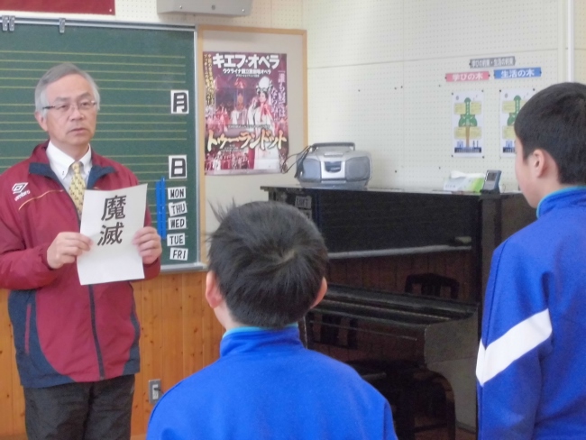 始めに子どもたちは、校長先生に豆をまく理由として、豆を「魔(を)滅(する)」と考えられていることを教えてもらいました。