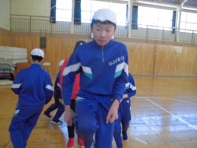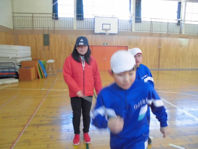 子どもたちは一人一人の縄跳びの練習の他にも、大縄で八の字を跳んで2分間で何回跳べるかにも挑戦しています。
